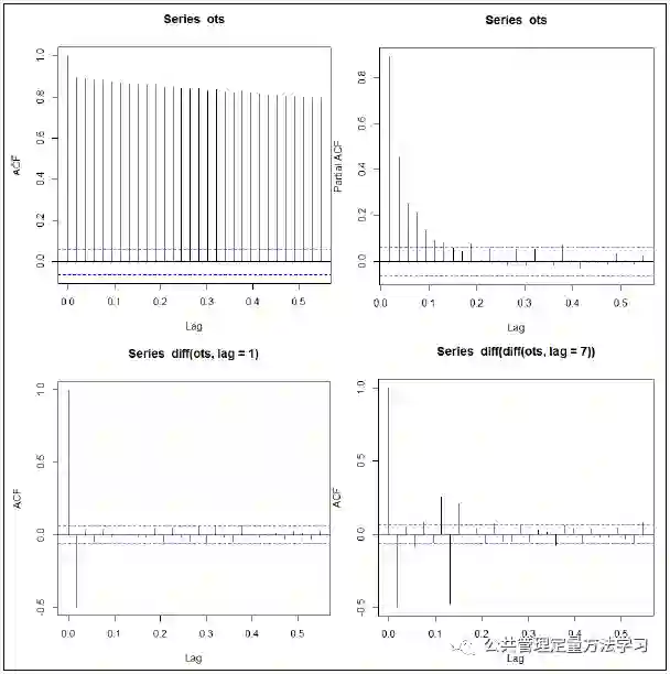 平稳性判断主要用到两个工具:自相关函数(auto correlation function, ACF)和偏自相关函数(patialauto correlation function, PACF);对于non-stationary的数据,ACF图不会趋向于0,或者趋向0的速度很慢;对于含有趋势的非平稳时间序列,通常可以通过引入ARIMA模型对其变换:ARIMA模型对于非平稳时间序列采用的方法是,运用差分运算提取趋势信息,最终把序列变为平稳序列。下面的四张图从左到右、自上而下分别对应原始数据的自相关函数、原始数据的偏自相关函数、原始数据一阶差分后的自相关函数、原始数据去除周期性后一阶差分的自相关函数: