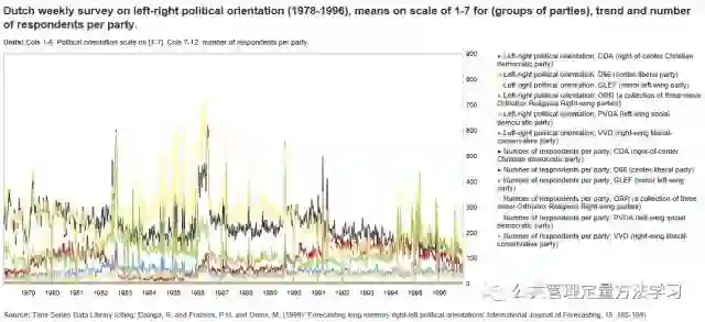 该数据库提供5种格式的数据下载:Excel (.xls)/(.xlsx)、CSV (,)/(;)以及TSV (\t);小编选用TSDL中的“Dutchweekly survey on left-right political orientation (1978-1996)(左右政治倾向的每周调查)”数据来演示时间序列分析的R语言实现过程;该数据的受访者针对荷兰6个主要政治团体:CDA(中央基督教民主党派)、D66(中央自由党)、GLEF(小左派)、ORR(三个小正统宗教右翼派对的集合)、PVDA(左翼社会民主党派)、VVD(右翼自由保守党),以1-7分计分的形式,表达自己的“左-右”政治倾向;为方便演示,本期仅使用CDA部分的数据。