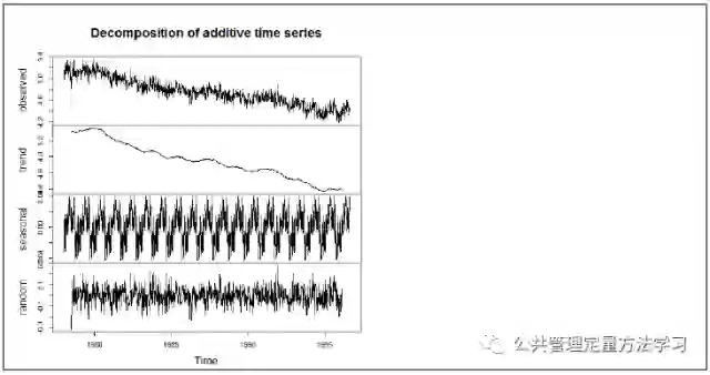 时间序列数据分为非季节性数据和季节性数据:一个非季节性时间序列包含一个趋势部分和一个不规则部分,分解时间序列就是估计趋势的和不规则的这两个部分;一个季节性时间序列包含一个趋势部分、一个季节性部分和一个不规则部分,分解时间序列就意味着要把时间序列分解为这三个部分。下图自上而下展现了原始的时间序列图、估计出的趋势部分、估计出的季节性部分、估计得不规则部分。季节性变动指由于季节因素导致的时间序列有规则变动;无季节变动的数据不需要这一步处理: