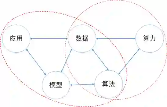 人工智能应用落地的五大决定性要素分别是应用、模型、数据、算法和算力,其中数据、算法和算力三大要素经常被提到,但在对于人工智能落地应用而言,应用和模型是必不可少的两个要素。五大要素间的关系如下图所示。