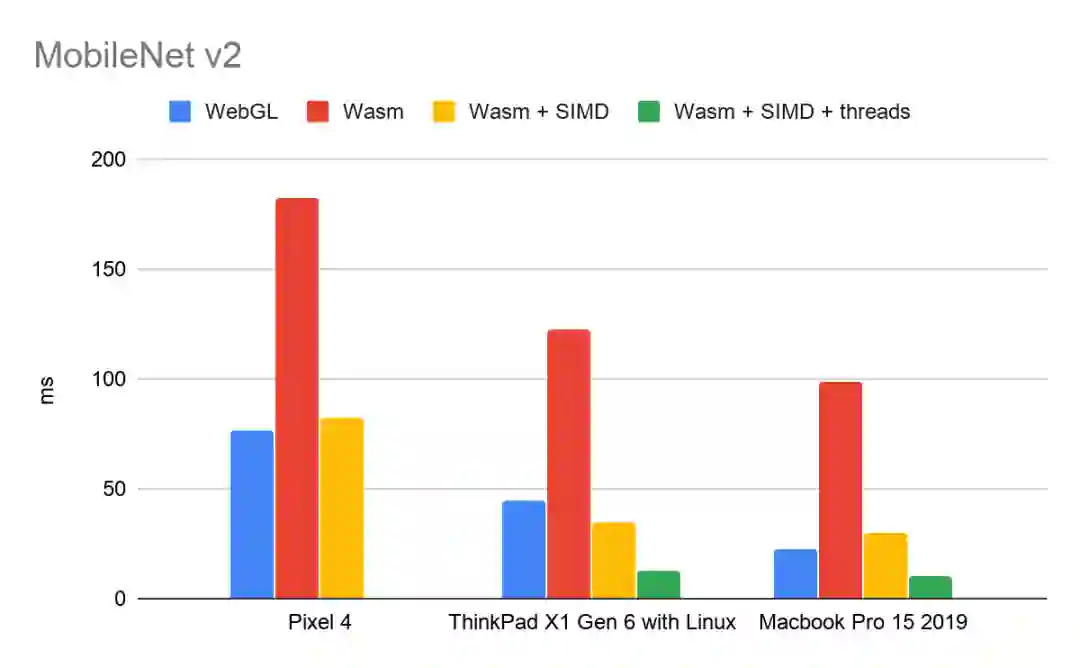 我们希望不断提高 Wasm 后端的性能。我们正在密切关注 WebAssembly 中不断发展的规范,包括用于更广泛 SIMD 的灵活向量,准融合乘加,以及伪最小和最大指令。我们也期待着 ES6 模块对 WebAssembly 模块的支持。与 SIMD 和多线程一样,我们打算在这些功能可用时充分加以利用,而不影响 TF.js 用户代码。