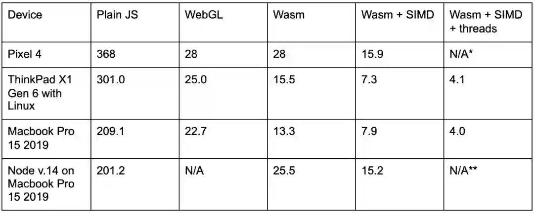 *注:由于移动浏览器中的多线程支持仍在开发中,因此 Pixel 4 无法使用 TF.js 多线程 Wasm 后端基准。iOS 中的 SIMD 支持也仍处于开发阶段。