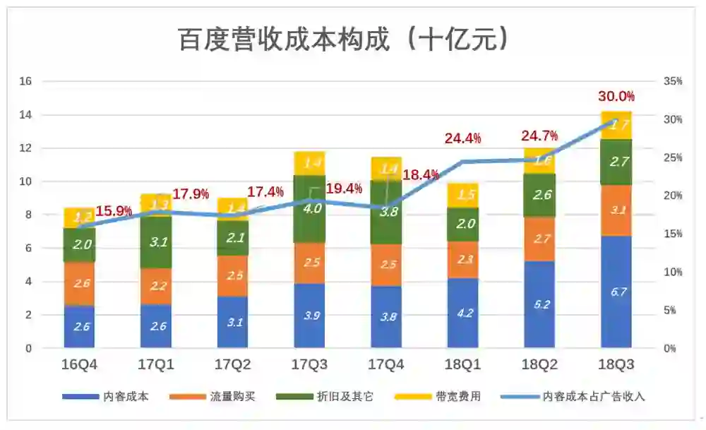 百度营收成本包括四大块:内容成本、流量购买、折旧及其它及带宽费用。其中最沉重的负担是内容成本,2017年累计支出134亿,2018年前个三季度支出161亿。其中Q3支出67亿,占广告收入的30%。
