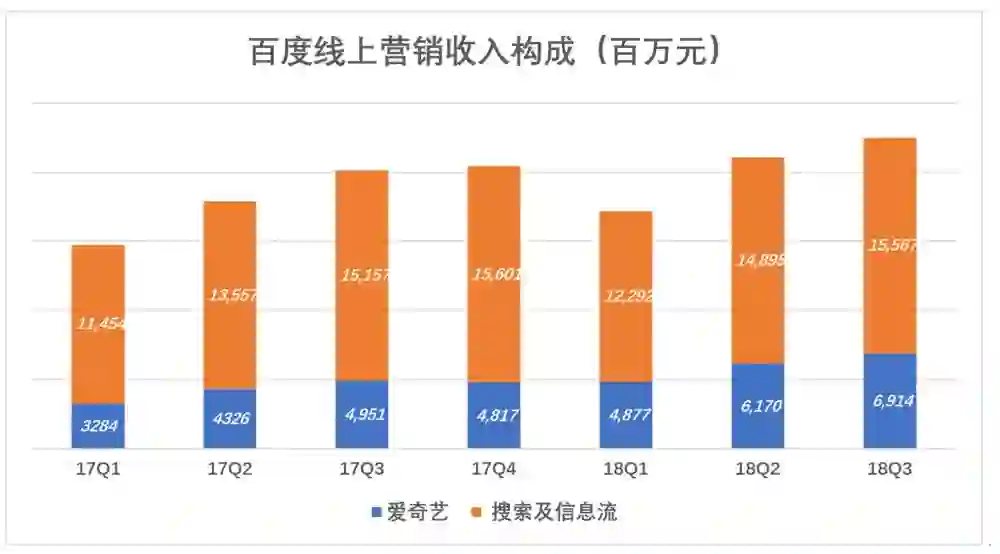 爱奇艺的广告收入是“线上营销”收入的子集,爱奇艺之外的广告收入主要来自搜索和信息流。