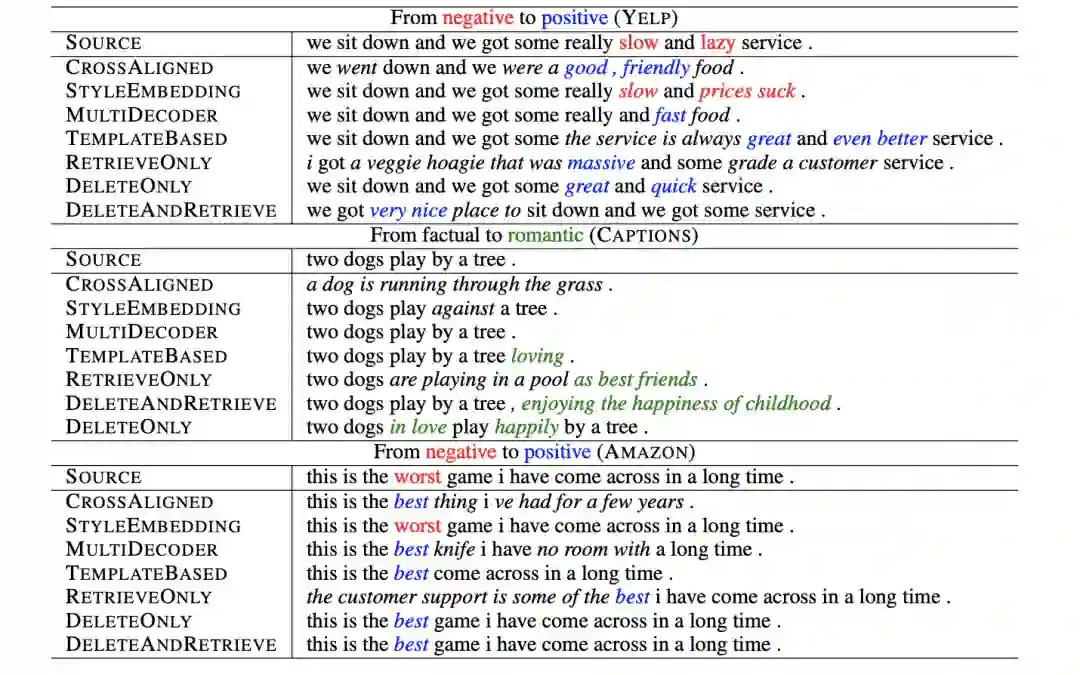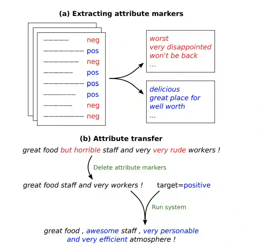 第二篇论文,几乎也是一样的思路。但是在具体实现上要更直接一点。第二篇论文在进行 style transfer 的时候,基于的是这样的假设:文本的一些属性(attribute),比如文本传达出来的情感信息等,可以体现在文本中的某些特定词汇上。通过改变这些词汇,就可能直接改变整句文本的性质属性(value)。