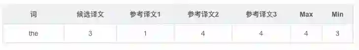 首先统计候选译文里每个词出现的次数,然后统计每个词在参考译文中出现的次数,Max表示3个参考译文中的最大值,Min表示候选译文和参考译文中的最大值的最小值。例如,词"the":