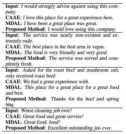但是也可以看到,这篇工作提出的方法在大幅提高 BLEU 的情况下,ACC 也有一定损失。可以从这个结果看到,想要非常自然地融入 sentiment words 并且不破坏语义和语法,是很困难的事情。看一些直观的转换结果: