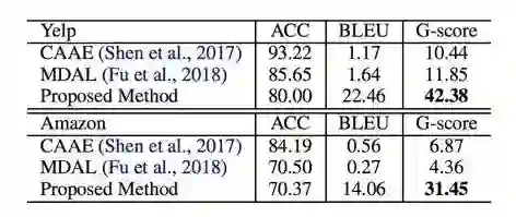 从实验结果来看,过去的工作主要都只考虑了 style transfer 的成功与否(sentiment accuracy),而没有显性地考虑 content perserving,所以确实在 BLEU 指标下表现很差。
