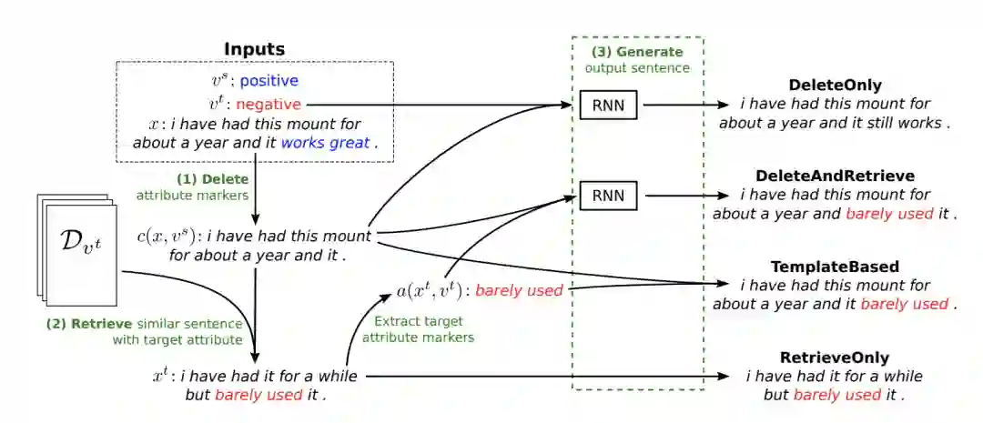 由上面的示意图可以看出,作者将那些具有指示功能的特定词称为 attribute marker,通过(主要)改变这些 marker,进行 attribute transfer。文章进一步提出了4种具体的方法来改变 marker。