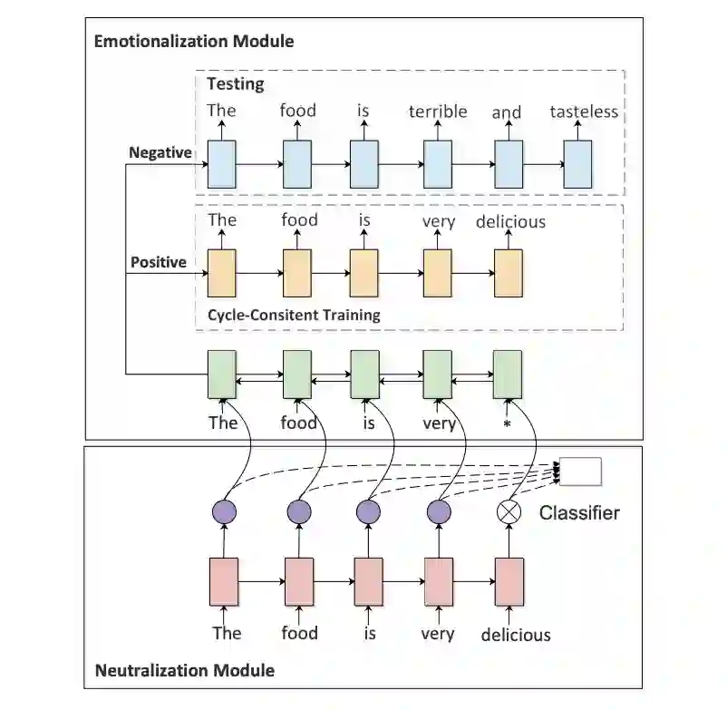 为了解决这个问题,这篇工作使用了两个 module,一个 neutralization module 用于提取 non-emotional content,另一个 emotionalization module 用于生成或者说融入 sentiment words。