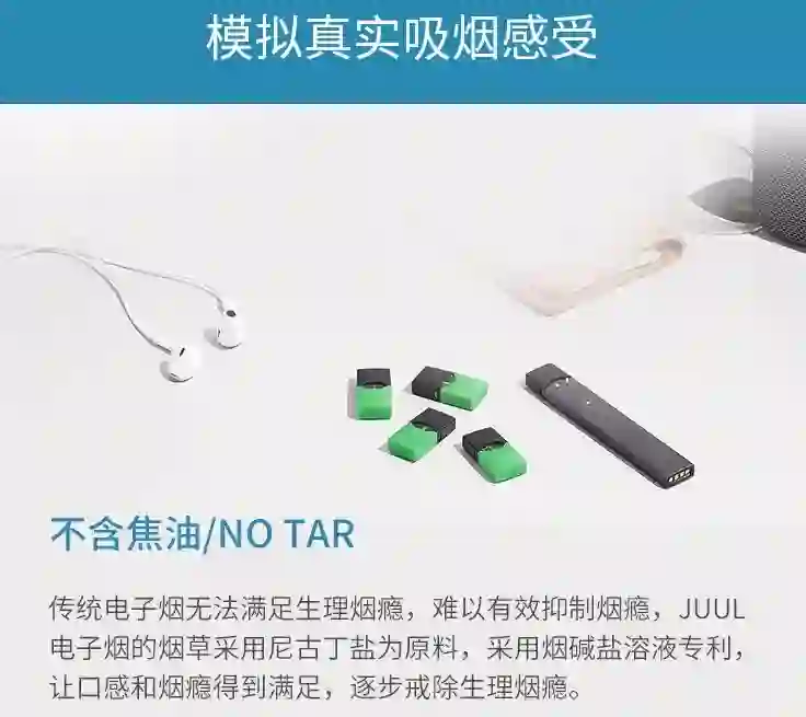 烟弹和烟杆分体设计,JUUL采用尼古丁盐为原料,采用盐碱盐溶液专利,让口感和烟瘾得到满足。