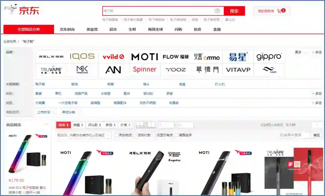 在京东和天猫上,国产品牌大多在300元以下,罗永浩参与的小野电子烟售价298元,RELX悦刻旗舰产品多为299元,最贵的一款套装产品价格398元;