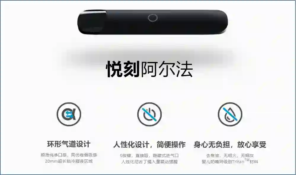 悦刻阿尔法,是官网上最贵的一款产品,采用了环形气道设计,有着高仿卷烟的吸感;