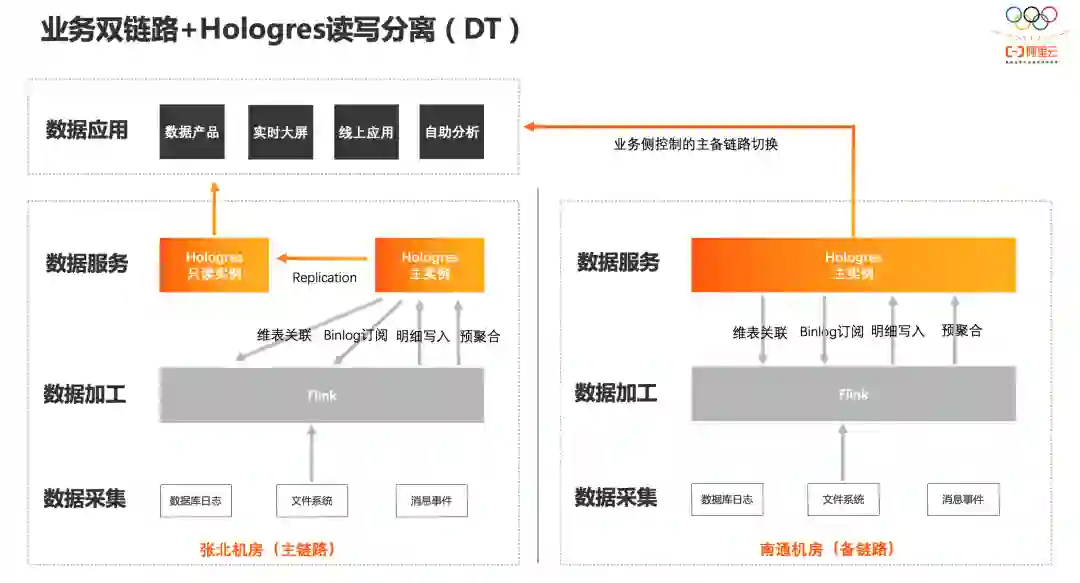 例如,今年双11 DT部门上了Hologres读写分离方案(由两个Hologres实例分别负责实时写入和实时查询,但共享一份底层数据存储),同时有多个读实例分别负责不同类型的查询,这样就可以保证读写隔离、分析查询和服务查询隔离,且只有一份数据。也就是所谓的One Data,Multi Workload。