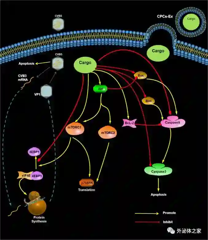 CPC衍生的外泌体(CPCs-Ex)工作示意图病毒性心肌炎(Viral myocarditis,VMC)是扩张型心肌病和心源性猝死的常见原因。寻找有效的VMC疗法仍然是一个巨大的挑战,而关于心脏祖细胞(cardiac progenitor cells,CPC)的研究可能为VMC的治疗提供一个转折点。CPC是一组分布在整个心脏的异质细胞,能够分化为特定的几种细胞类型,包括心肌细胞(CMs)、血管平滑肌细胞和内皮细胞(ECs),为心脏再生和功能重建提供了广阔的前景。到目前为止,干细胞治疗在心脏修复方面取得了令人鼓舞的结果。此外,与来自骨髓或脂肪组织的干细胞相比,来自成年心脏的CPCs已成为心脏细胞治疗的最好的候选者。然而,CPC直接在体内转分化为心脏组织被认为是不可能实现的。研究表明,成人干细胞治疗的机制是通过旁分泌释放含有生长因子和细胞因子的细胞外囊泡来发挥抗凋亡、抑制免疫和促进血管生成的作用,外泌体是源自CPCs的细胞外囊泡的主要活性成分。外泌体是在生理和病理条件下从树突状细胞(DC)、巨噬细胞、T细胞和其他组织起源的细胞通过胞吐作用分泌的纳米级(30–100 nm)颗粒,携带有蛋白质、脂质和调节性核酸,例如外泌体可以将小分子RNA和大的非编码RNA传递到受体细胞中。一些临床前研究表明,与细胞移植相比,CPC衍生的外泌体(CPCs-Ex)对心脏修复具有更好的治疗作用。实际上,包含特定药物或试剂的CPCs-Ex已被有效地用于治疗心血管疾病。在急性心肌缺血再灌注小鼠模型中,Sca1 + CPCs-Ex可以通过抑制caspase-3 / 7来减少细胞凋亡。富含miR-21的CPCs-Ex通过靶向PDCD412来预防心肌细胞凋亡。一项对新生儿CPCs-Ex进行了深入的蛋白质组学分析发现外泌体中存在着高水平的胰岛素样生长因子-1(可促进心脏保护、抑制细胞凋亡),提示CPCs-Ex具有抗凋亡作用。柯萨奇病毒B(CVB)是微小RNA病毒家族的成员,是一种常见的肠病毒,可引起各种人类全身性炎症性疾病,例如心肌炎、脑膜炎和胰腺炎,而六种CVB血清型分别会造成不同的疾病和症状,其中婴儿和儿童更容易受到CVB的侵害。CVB诱导的VMC目前缺乏有效的治疗方法。几种临床前干细胞疗法在减少炎症和改善心肌功能方面取得了一些进展,但仍不能令人满意。作为一种无细胞的治疗方法,外泌体可以避免许多细胞治疗的局限性。CPCs-Ex可以预防星形孢菌素诱导的心肌细胞凋亡,并且比MSCs分泌的外泌体具有更好的心脏保护作用。但是,CPCs-Ex在VMC中的作用仍未被研究。在这项研究中,研究人员旨在探索CPC衍生的外泌体(CPCs-Ex)是否可以通过mTOR信号途径减少病毒性心肌炎(VMC)的细胞凋亡。在体外实验里,CVB3病毒感染H9C2细胞后添加外泌体,以检测CPCs-Ex的抗凋亡作用。与对照组相比,外泌体处理后的细胞凋亡率降低,同时病毒衣壳蛋白1(VP1)的表达下降,Bim /caspase家族的促凋亡因子表达降低。同时,CPCs-Ex促进了Akt、mTOR和p70S6K的磷酸化,抑制了4EBP1的磷酸化。在体内实验里,感染CVB3的心肌细胞的凋亡情况、CVB3和促凋亡因子的表达以及Akt / mTOR因子的磷酸化结果与体外实验结果一致。研究人员用雷帕霉素和MK-2206抑制Akt / mTOR信号通路,同时将大鼠4EBP1、p70S6K、Akt1和Akt2转染H9C2细胞里建立了稳定转染的细胞系。在雷帕霉素或MK-2206处理组中,CPCs-Ex降低了H9C2细胞的凋亡和CVB3 mRNA的表达。在Akt2、p70S6K和4EBP1过表达组中,CPCs-Ex促进CVB3诱导的细胞凋亡、促进了VP1表达和caspase-3的裂解。因此, CPCs-Ex通过抑制CVB3的病毒增殖并调节mTOR信号通路以及Bcl-2和caspase家族的表达,在CVB3感染的细胞中发挥抗凋亡作用。病毒性心肌炎主要由CVB3感染引起,目前尚缺乏特定的治疗方法,该研究确定了CPCs-Ex在CVB3感染的细胞和大鼠中的抗凋亡作用,表明CPCs-Ex可能是治疗病毒性心肌炎的有效工具。研究人员相信,随着对CPCs-Ex功能的更深入研究,在治疗病毒性心肌炎方面将取得更多突破。参考文献:Li X, Yang Z, Nie W, Jiang J, Li S, Li Z, Tian L, MaX. Exosomes derived from cardiac progenitor cells attenuate CVB3-induced apoptosis via abrogating the proliferation of CVB3 and modulating the mTOR signaling pathways. Cell Death Dis. 2019 Sep 18;10(10):691. 【科研成长加油站】四天学会Nature级的图表及插图制作方法(2019/9/26-29 广州)单细胞测序数据挖掘与课题设计学习班(10/12-13 上海)DNA甲基化与表观遗传学数据挖掘与分析学习会(10/26-27 上海)中药复方发表SCI如何突破5分大关(10/19-20 北京) 万用模版SCI英文论文写作法学习会 (11/22-24 上海) TCGA、GEO及SEER公共数据库挖掘与应用学习会 (10/26-27 上海) 系统评价与meta分析(11/7-10 上海);临床科研设计与数据管理(11/12-14 上海)生物医学数据挖掘培训班 | 10月19-20 北京 【官宣】外泌体之家| 外泌体学习班即将开班