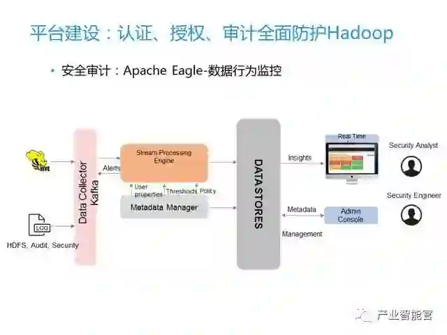 安全防护的最后一环是审计。审计我们用的是Apache Eagle框架,它是一个高度可扩展的行为监控警报平台,采用了灵活的应用框架和经过实践考验的大数据技术,如 Kafka,Hbase和 Storm。提供了基于元数据驱动的告警引擎和高度可定制的告警策略来报告异常行为的发生,实时监控用户的操作行为,实时检测敏感数据访问和恶意数据操作。