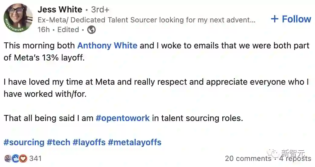 「今天早上,我和Anthony White都收到了裁员的电子邮件。我很喜欢我在Meta度过的时光,并且非常尊重和感谢与我共事过的每一个人。」她在 LinkedIn 上写道。