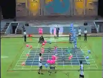 图中红蓝两队在争夺山脚一圈的得分,蓝队操纵着手动机器人,将蓝球摆放在红球上,以争取覆盖得分。红队也不能对此坐视不理,快速地让机器人把蓝球推到地上,露出了原本的红球。蓝队见状,报复般地把旁边圆管中的红球捡了出来。