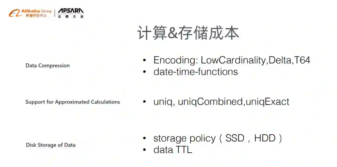 关于计算存储成本,ClickHouse有非常高的数据压缩比例,其本身就是一个列的数据库,在这里着重介绍一些ClickHouse比较有效的功能: