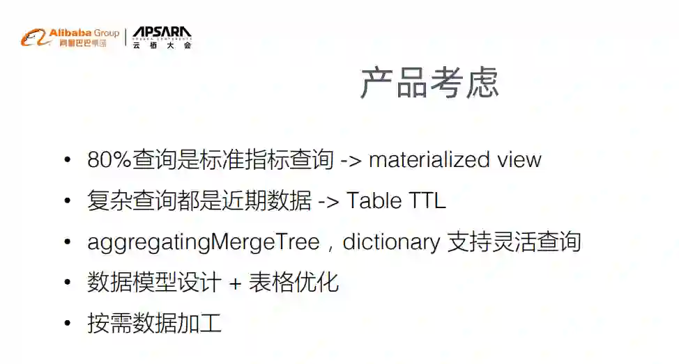 按需数据加工:因为ClickHouse压缩数据比例非常高,可以把它放到底层。当在复杂的查询情况下,按客户的需求,进行复杂的查询;然后再把一些数据从某一些数据库挪到其他任何的数据库中,从而加工出来一个单独的表格,之后把这个表格,落到客户的odps上。我们能否通过这种方式来更好的服务我们的用户,而不像传统的方案那样,需要维护一个很大的集群用来支持所有的查询或者计算;能否严格按照用户需要调动任务,从而调动此任务所产出的数据,就可以直接把结果数据分享给客户,这份数据可以通过下面table的TTL ,几天后可以把这些数据删除,从而减少整个查询所消耗的集群成本。