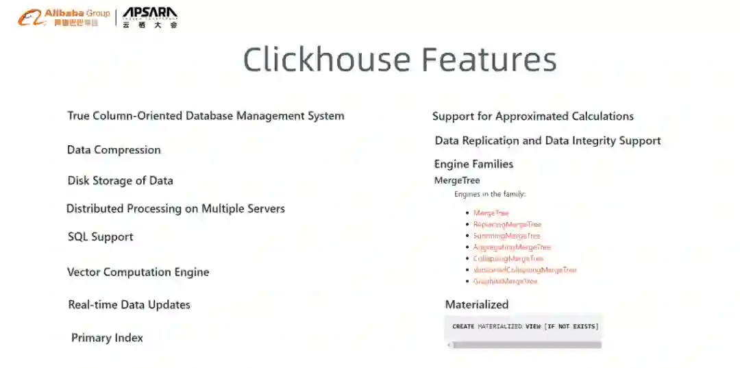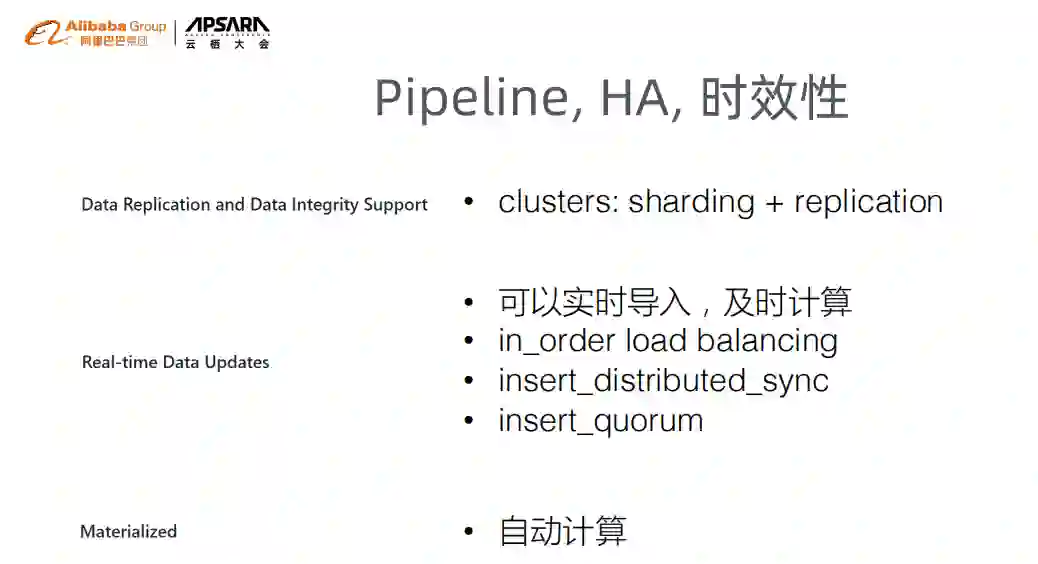 Real-time Data Updates:另外就是上文提到的实时,在insert distributed中我们可以通过各种不同的接口,直接把数据导入。其次,materialized view的一个优点是自动计算,每次有insert时都会check上面的计算。在大部分的情况下,其都是定制的distributed,可以在减少pipeline管理的情况下,直接把数据导入并且计算出结果。除此之外,其他的方面通常属于具体的技术层面,都是用来辅助我们管理数据的导入情况。