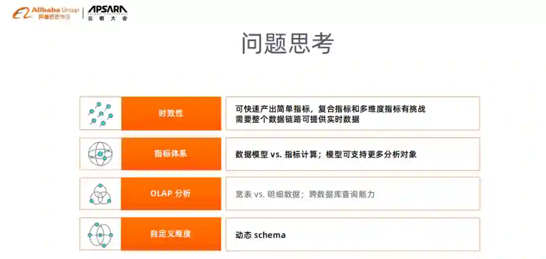 灵活的OLAP分析:在传统的行业或者方法中,需要一个BI, 让他产出数据,这里产生的问题就是如果你有很多业务,每个团队都需要这个BI来支持,让他产出数据,然后这个人每天就写sql,无暇顾及其他业务。我们希望赋能我们的每个行业,比如说分析师,或者小二,当卖家想问问题时,可以通过我们的产品进行交互式的分析,来解决问题。未来,我们希望小二能通过语音,说“今天卖的最好的东西是什么?”。当然了,解决这个问题可能需要五到十年的时间,这是我们未来的发展方向。对于当下,迫切需要解决的问题是一大堆小伙伴们天天只写sql,无暇顾及其他的业务。