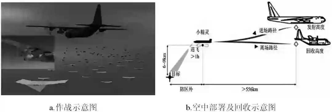 2015年8月,DARPA在前期工作基础上宣布启动一个旨在实现空中可回收无人系统的“小精灵”项目,如图1所示。该项目的目标是研究低成本的无人机群,以高效、快速替代的方式搭载情报、监视、侦察(ISR)等任务载荷,同时在载机平台(运输机、轰炸机等)中开发一个可以空中实现无人机集群快速发射和回收的装置,使得未来的作战飞机可以快速部署廉价、可重复使用的无人机集群,并进行概念验证飞行演示。集群可以通过载机平台的指挥控制及之间内部信息协同共享,突破敌方防御系统,快速展开任务执行计划,任务完成后进行回收。