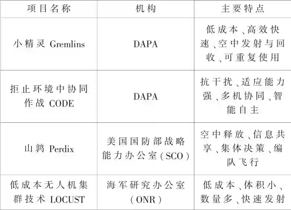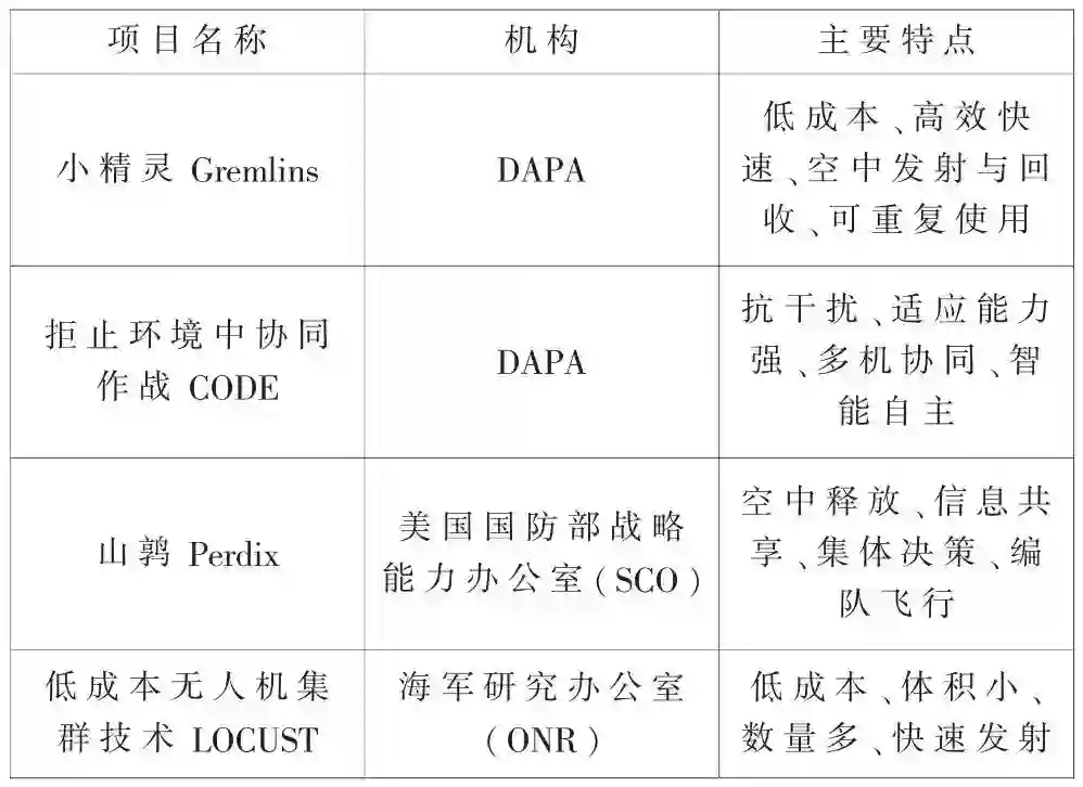 通过单体之间的紧密协作,体现智能无人机集群体作战性能的优越性,世界各国均致力开展智能无人机集群的研究,已经成为无人机领域的一个重要发展方向。美国通过国防高级研究局 (Defense Advanced Research Projects Agency,DARPA)和海军研究实验室(United States Naval Research Laborator,NRL)等机构全力探究无人机集群最新技术,应用于军事发展,以保证其全球军事技术领先。目前典型的无人机集群技术有:小精灵(Gremlins)项目、拒止环境中协同作战项目(CODE)、“山鹑”(Perdix)微型无人机项目、低成本无人机集群技术项目(LOCUST)等[5-7],其主要特点如表1所示。