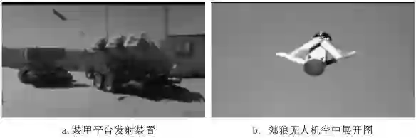 2015年4月美国海军研究办公室公布了关于低成本无人机集群技术(Low-Cost UAV Swarming Technology,LOCUST)项目的研究状况,海军于2016年4月实现了30架郊狼无人机的快速发射和完全自主编队飞行技术验证。该项目旨在快速发释放大量小型无人机,通过自适应组网及自主协同技术,携带各类侦查与攻击载荷,在数量上以绝对压倒性的优势赢得战争。LOCUST项目发展了如郊狼等一系列小型折叠翼无人机和多管发射装置,这类装置可以装备到装甲车、飞机、舰船等平台上,并实现1架每秒的速度释放出无人机集群,如图2所示。