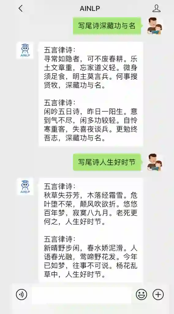 除了藏尾诗生成器,我还衍生了一个“写尾诗”的功能,就是输入几个字,这几个字一定要出现在古诗的尾部,关注AINLP公众号,回复“写尾诗输入内容”触发: