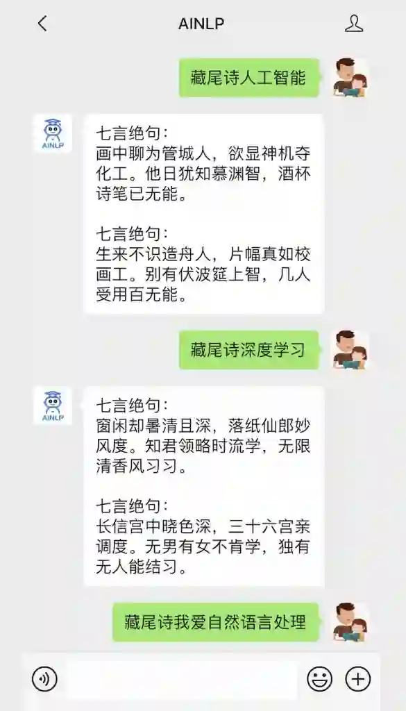 自从AINLP公众号后台对话上线自动写诗功能,特别是藏头诗生成器的功能后,发现有不少同学在使用,特别是过程中发现有的同学不仅需要藏头诗,还需要藏尾诗,这也让我第一次了解了藏尾诗。不过如果让用户随意输入尾词,诗句尾部的押韵基本上破坏了,但是作为大众娱乐需求,这功能还是可以有的。所能想到的第一个方法是:基于目前的模型强制在结尾处替换关键字,然后逐句生成,但是这种方法合成的藏尾诗必定会很生硬;第二个方法直接训练一个反向模型:基于GPT2-Chinese,用之前的古诗训练语料逆序训练了一个古诗反向生成模型,然后对于用户的输入,同样也反向处理,最后再正向呈现给用户,这种方法生成的藏尾诗应该会平滑很多。所以说干就干,基于第二种方法训练了一个藏尾诗生成器模型,感兴趣的同学可以关注AINLP公众号,直接回复“藏尾诗输入内容”触发“藏尾诗生成器”,例如:
