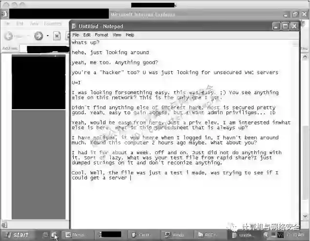 他冒着很大的风险,打开记事本程序,决定伪装成一名“n00b”黑客,也就是一个新手、技术菜鸟,和对方一样,看到这个口开着就进来了。他截取了一些与黑客对话的屏幕截图。注意看一下图1,他是如何对黑客进行社会工程的。约翰先开始对话,次行是黑客说的话。