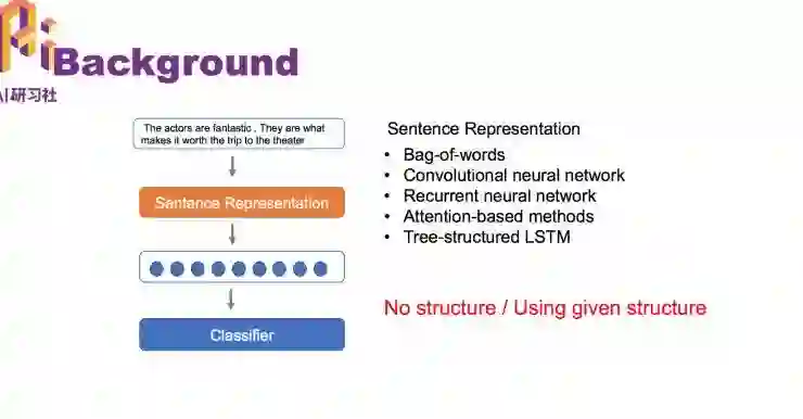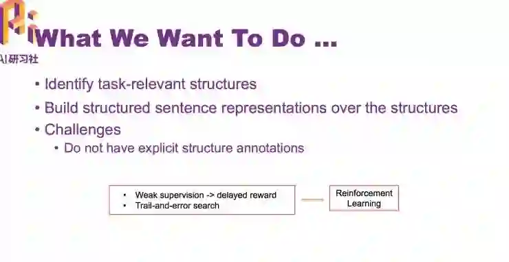 所以我们希望能够学到和任务相关的结构,并且基于学到的结构给句子做表示,从而希望能得到更好的分类结构。但面临的挑战是我们并不知道什么样的结构对于这个任务是好的,我们并没有一个结构标注能够指导我们去学这个结构。但我们可以根据新的结构做出的分类结果好不好从而判断这个结构好不好。