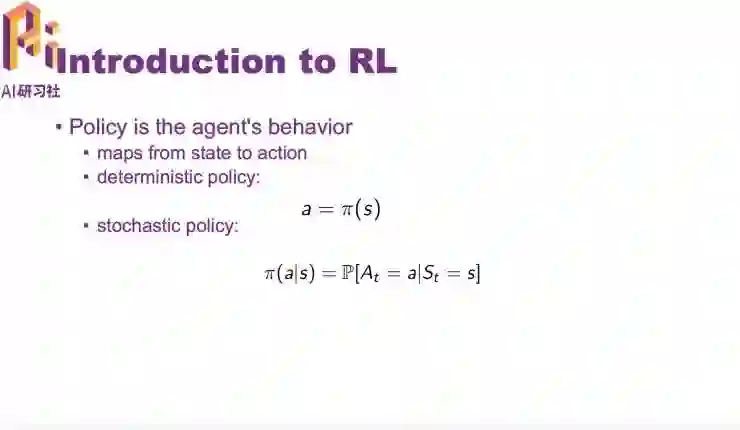agent会和环境做很多的交互,环境每次做的动作可能会有一个长期的影响,而不仅仅是影响当前的 reward。reward 也有可能延迟。在这里简单介绍一下 policy 的概念。policy 是决定一个 agent 的动作的一个函数。