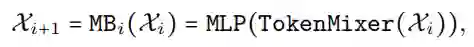 是输入图像,批大小为 B,空间大小为 [H,W],Y是所需的输出,m是Block的总数(深度)。MB由未指定的TokenMixer和一个MLP Block组成,可以表示如下: