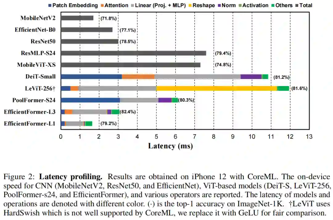 大多数现有方法通过从服务器 GPU 获得的计算复杂度 (MAC) 或吞吐量(图像/秒)来优化Transformer的推理速度。虽然这些指标并不能反映真实的设备延迟。为了清楚地了解哪些操作和设计选择会减慢边缘设备上的 ViT 推理,作者对许多模型和操作进行了全面的延迟分析,如图 2 所示,由此得出以下观察结果。