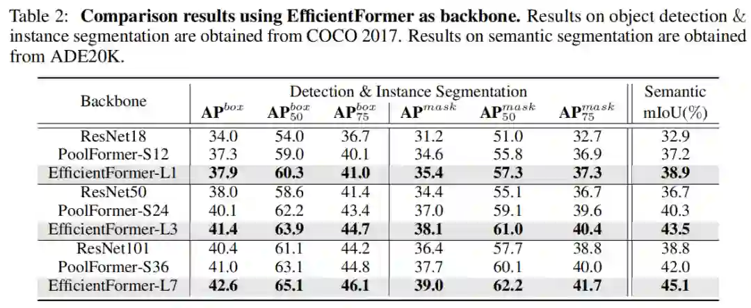 此外,通过使用 EfficientFormer 作为图像检测和分割基准的Backbone,观察到了卓越的性能。对上述问题提供了初步答案,ViTs 可以实现超快的推理速度和强大的性能。