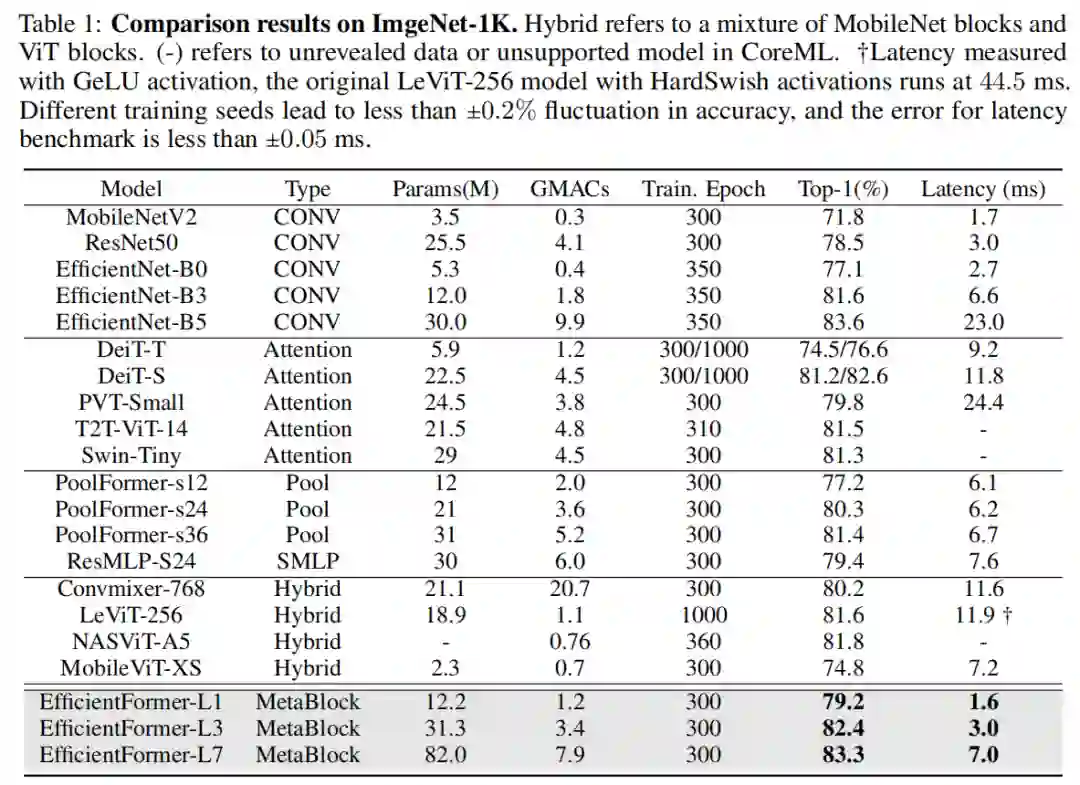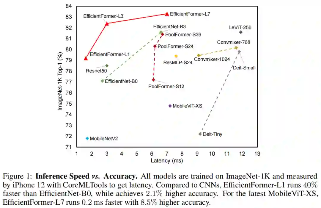 ViT的模型中使用的网络架构和ViT算子,并确定其低效的设计。然后引入了一个维度一致的纯Transformer(没有MobileNet Block)作为设计范式。最后,执行延迟驱动的瘦身以获得一系列最终模型,称为EfficientFormer。大量实验表明