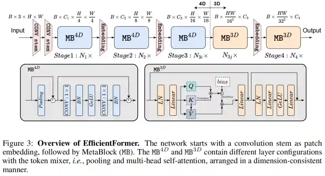 基于延迟分析,提出了 EfficientFormer 的设计,如图 3 所示。该网络由 patch embedding (PatchEmbed) 和meta transformer blocks,堆栈组成,表示为 MB: