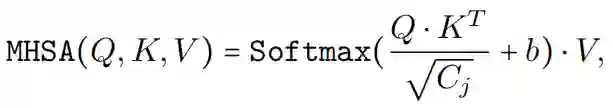 其中 Q、K、V 表示通过线性投影学习的query、key和value,b 是作为位置编码的参数化注意力偏差。