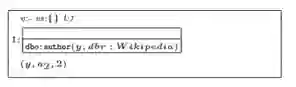 2. 对问句中的词进行 L2KB 推理过程,找到 Wikipedia 链接到的知识库中实体:Wikipedia,以及 created 链接到知识库中的属性:author,细节如图3,此时的结果构成的部分SPARQL成分为:
