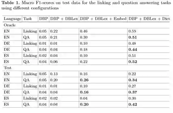 对于问题语言与知识库不相同的案例,作者提出的处理方式是利用多语言词典 Dict.cc 的词级别翻译配合 word embedding 检索找到知识库中可能的目标实体。