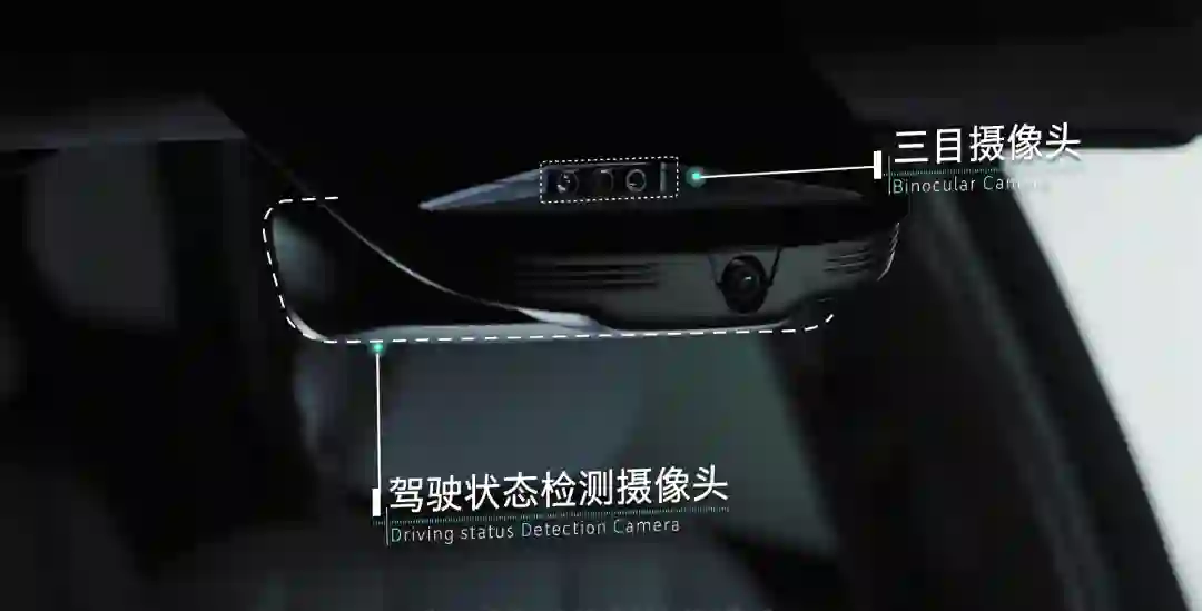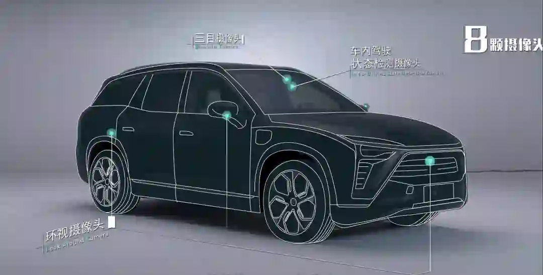 蔚来ES8全车共配备了8颗,分别是位于挡风玻璃上方的三目摄像头、四颗环视摄像头,和一个车内的驾驶状态监测摄像头。