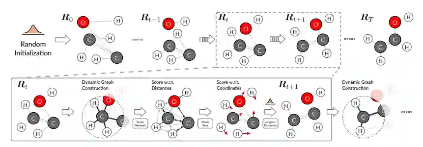 从 2D 分子图中预测稳定的 3D 构象一直是计算化学中的一个长期挑战。而最近,机器学习方法取得了相比传统的实验和基于物理的模拟方法更优异的成绩。这些方法主要侧重于模拟分子图上相邻原子之间的局部相互作用,而忽略了非键合原子之间的长程相互作用。然而,这些未成键的原子在 3D 空间中可能彼此接近,模拟它们的相互作用对于准确确定分子构象至关重要,尤其是对于大分子和多分子复合物。在本文中,作者提出了一种称为动态图评分匹配 (DGSM) 的分子构象预测新方法,该方法通过在训练和推理过程中根据原子之间的空间接近度动态构建原子之间的图结构来对局部和远程相互作用进行建模。具体来说,DGSM根据动态构建的图,使用评分匹配方法直接估计原子坐标对数密度的梯度场。可以以端到端的方式有效地训练整个框架。多项实验表明,DGSM 的表现远超该领域一流水平,并且能够为更广泛的化学系统生成构象,例如蛋白质和多分子复合物。