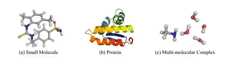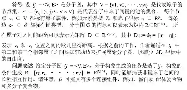 其中 Ebond、Eangle 和 Etorsion 对键合原子之间的局部相互作用进行建模,这些相互作用是在以前的方法中建模的。非键合原子之间的长程相互作用,表示为Enon-bonded,也是非平凡的,它通过不可忽略的静电力或范德华力等塑造分子几何形状。对于多分子复合物,非键相互作用主导复合物的几何结构。因此,构象生成的理想解决方案应该是同时捕获局部和远距离相互作用。在图 1 中,作者展示了三个典型的分子系统,其中长程相互作用在确定它们的构象方面起着关键作用。