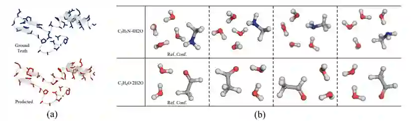 图5 (a) 生成的具有原子级坐标的蛋白质侧链构象的示例 (b) DGSM 生成的两个多分子复合物的构象。