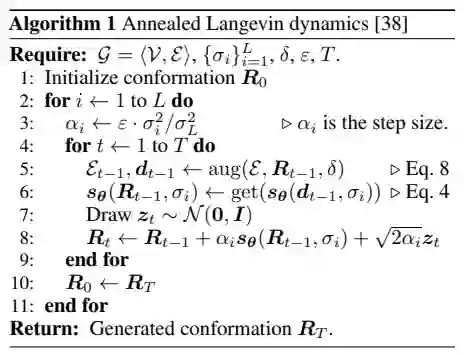 然后使用来自评分网络的梯度信息更新构象(方程 4)。这里提供算法1中的伪代码。