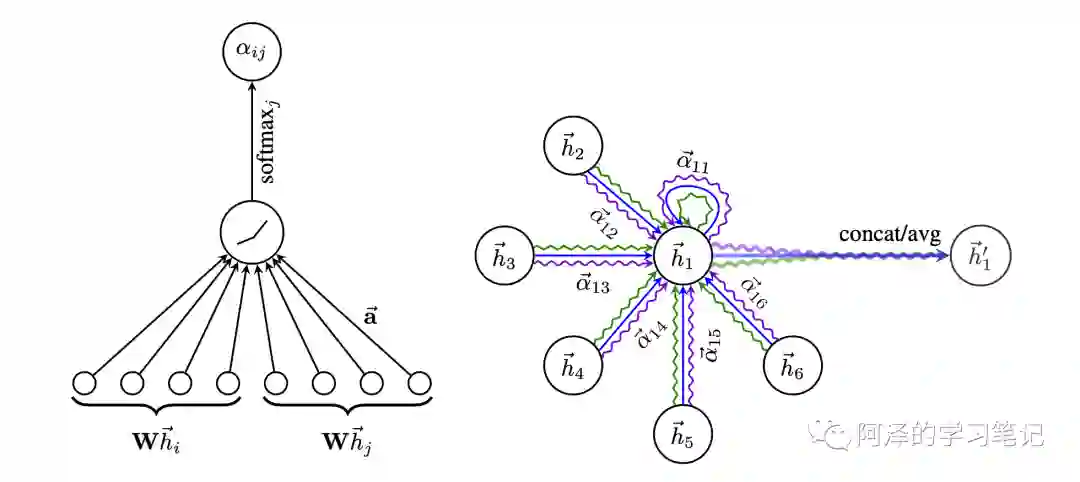 左边是两个节点的 attention 过程,右边是多头注意力的聚合(K=3,不同颜色代表不同的注意力)。
