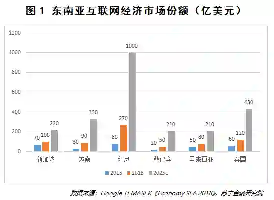 从政治经济因素看,“一带一路”战略的提出,使东南亚成为出海的战略选择地,无论是国企、互联网巨头、中小企业还是新兴金融科技公司,都将目光移向了东南亚。值得注意的是,东南亚的经济发展快速,已成为世界经济发展新的增长点,平均GDP增速高达5.2%,越南、柬埔寨更是超过7%。与网络借贷相关的互联网经济更是发展迅速(见图1),其中印尼表现尤为亮眼,预计到2025年,互联网经济将增长至1000亿美元,占整个东南亚地区的40%。
