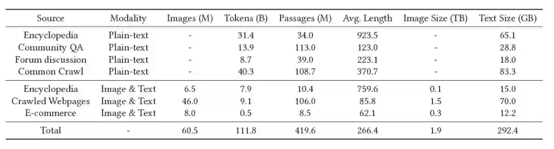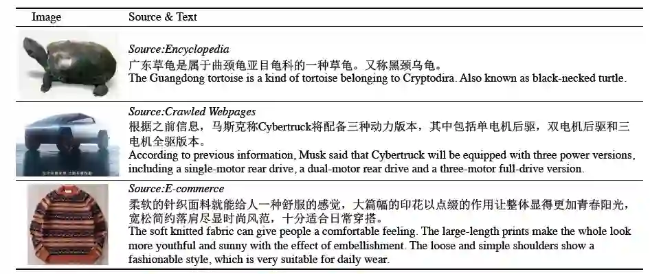 最后,研究者根据以上特点收集的多模态预训练的语料库的来源如上,包括百科全书、爬行网页、社区问答、论坛、产品描述等等。